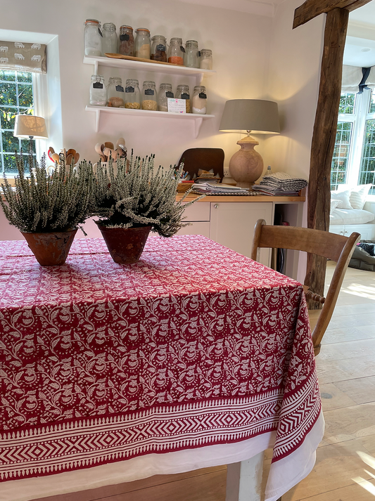 Brighten up your tabletop with one of our block printed table cloths. Created with vibrant colours, heavy organic Indian cotton and unique block prints. The quickest and easiest way to add a pop of colour!