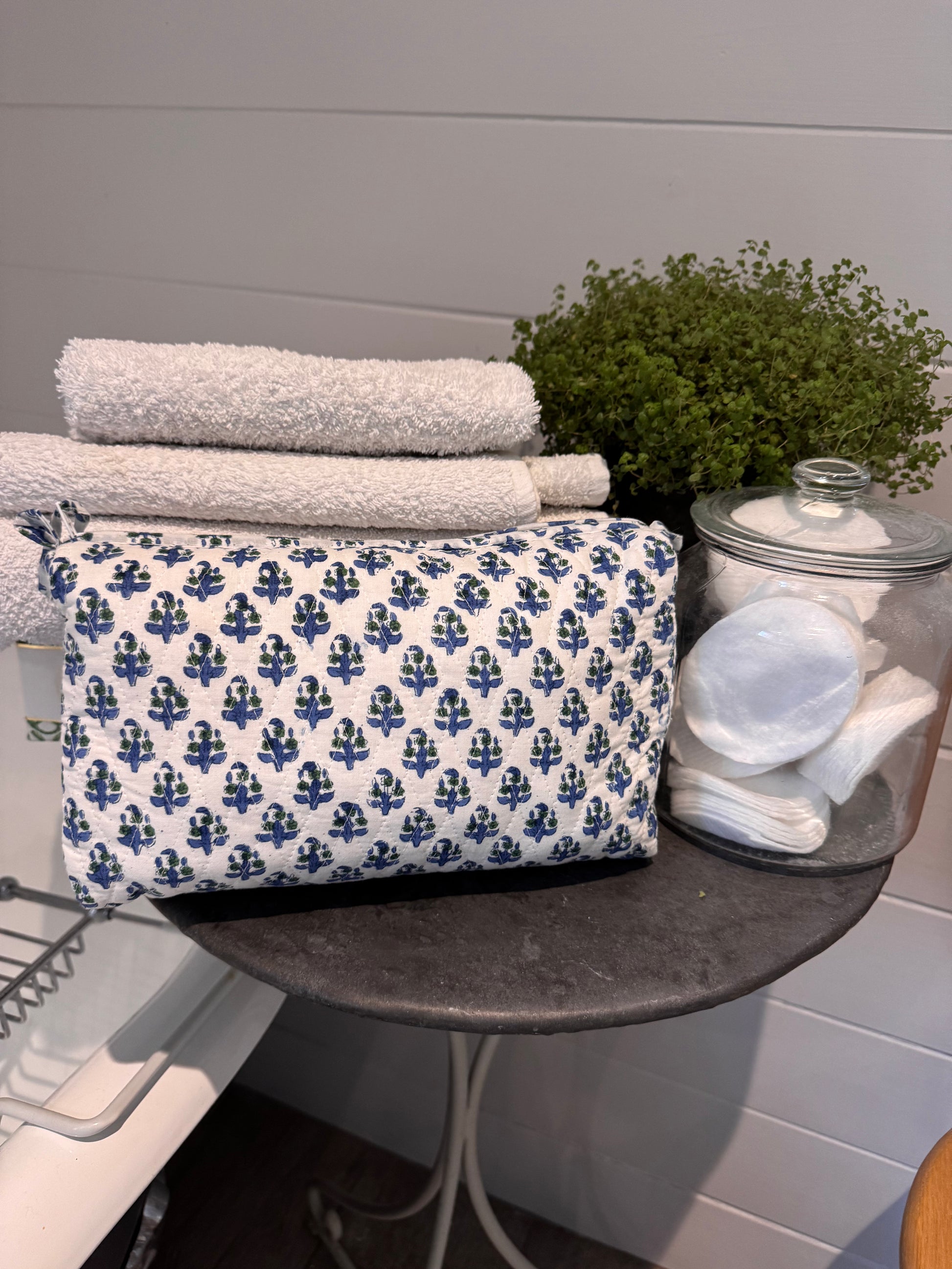 Our fun and colourful KaHo hand block printed quilted makeup bags are finished with a thick waterproof lining for storing make-up or toileteries.