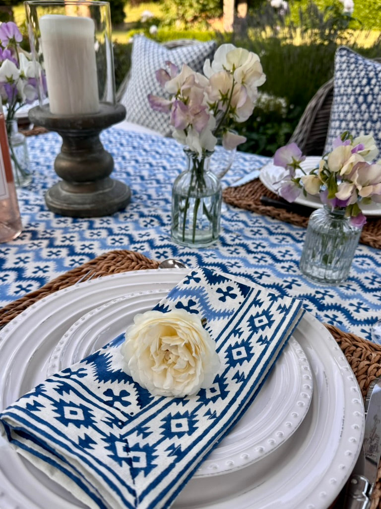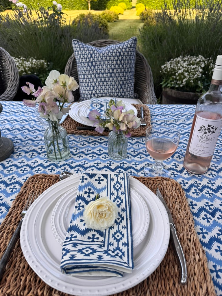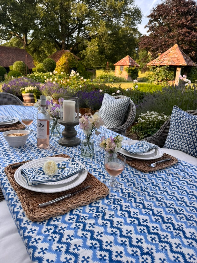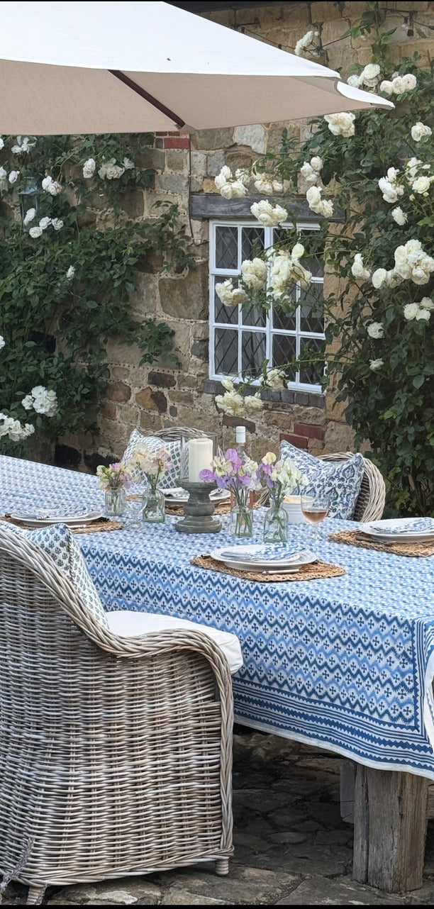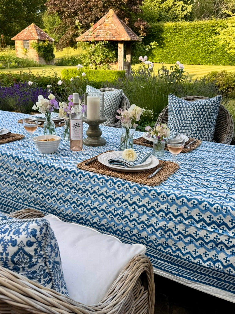 Equally gorgeous in the garden or on a kitchen or dining table! Fantastic for everyday or super-special gatherings surrounded by friends. 100% heavy organic quality cotton. Vibrant and happy colours. Each design has its own striking border. Washes beautifully. Pair with Blue KaHo Zig Zag Napkins and contrasting cushions around the table - the bright blue and denim blue Acorn cushions work particularly well with this cloth.