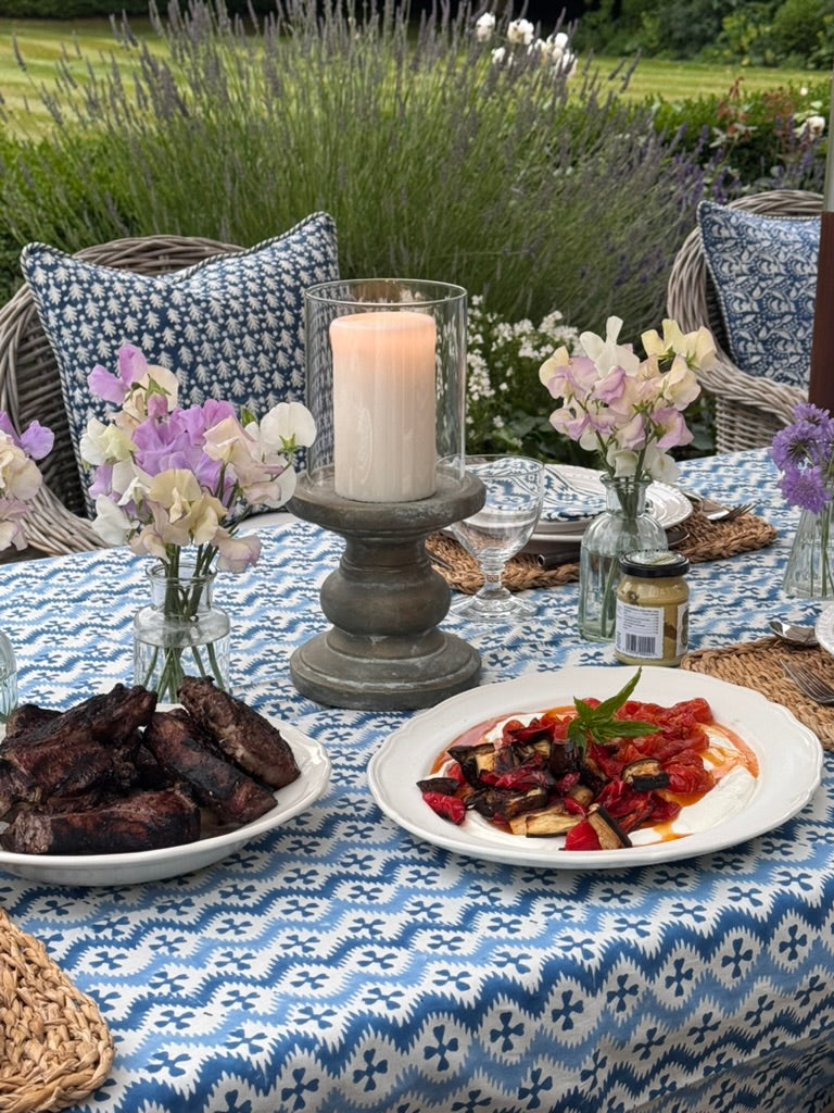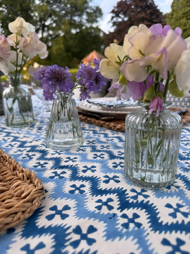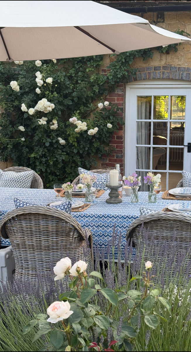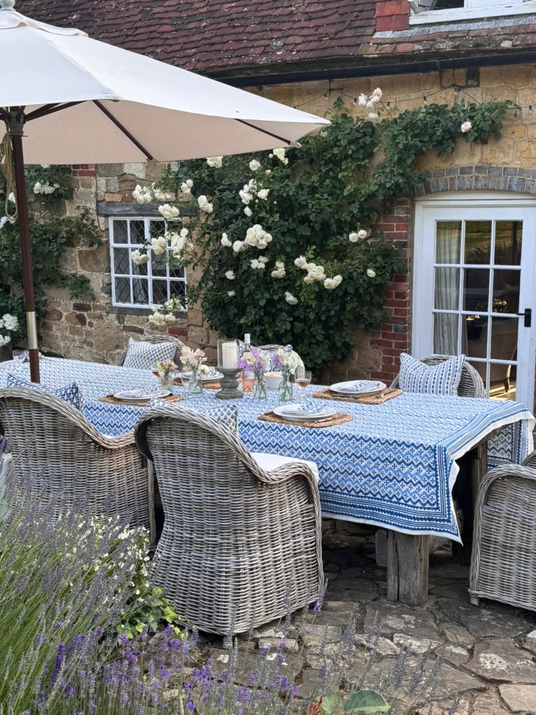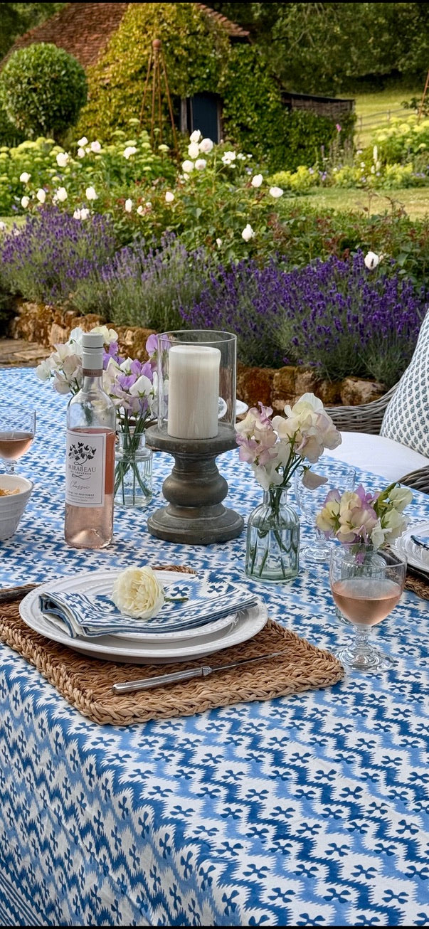 Equally gorgeous in the garden or on a kitchen or dining table! Fantastic for everyday or super-special gatherings surrounded by friends. 100% heavy organic quality cotton. Vibrant and happy colours. Each design has its own striking border. Washes beautifully. Pair with Blue KaHo Zig Zag Napkins and contrasting cushions around the table - the bright blue and denim blue Acorn cushions work particularly well with this cloth.