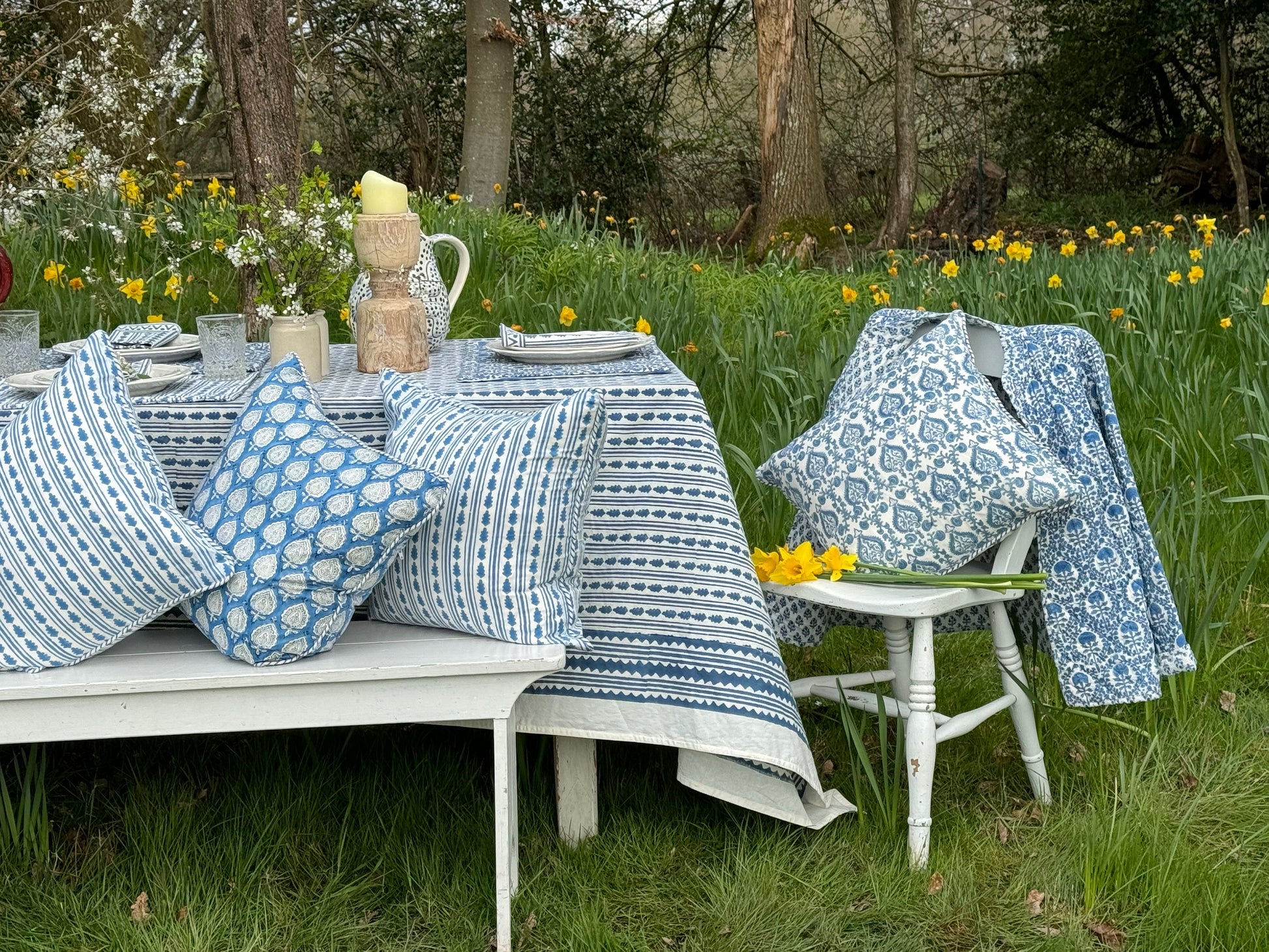 Equally gorgeous in the garden or on a kitchen or dining table! Fantastic for everyday or super-special gatherings surrounded by friends. 100% heavy organic quality cotton. Vibrant and happy colours. Each design has its own striking border. Washes beautifully. Pair with Blue KaHo Stripe Napkins or Blue Trellis Napkins and contrasting cushions around the table!