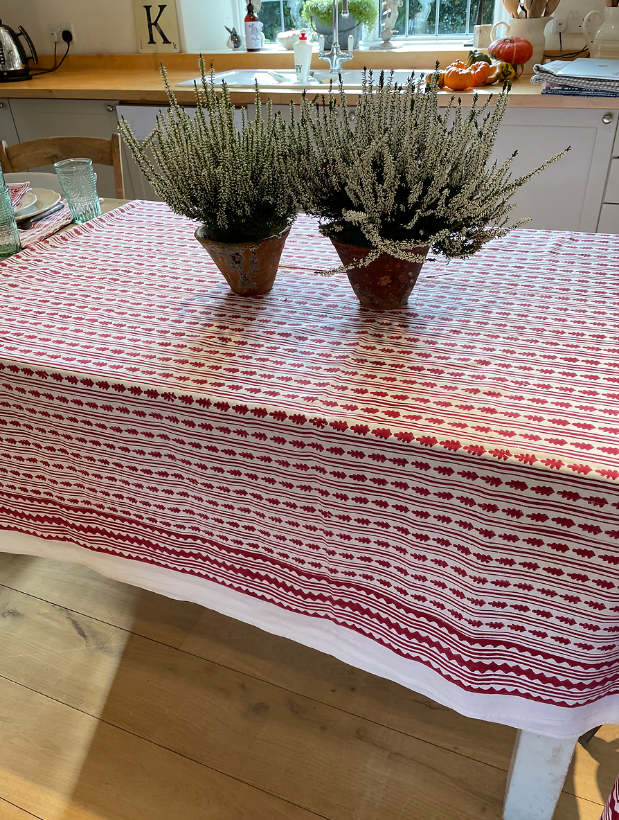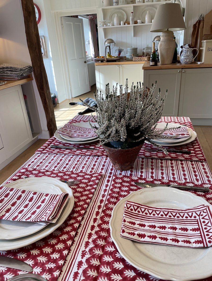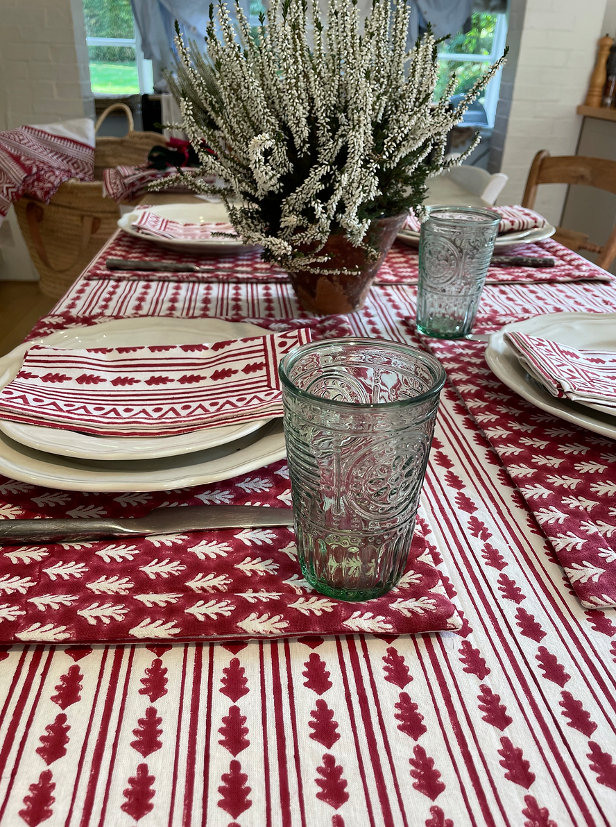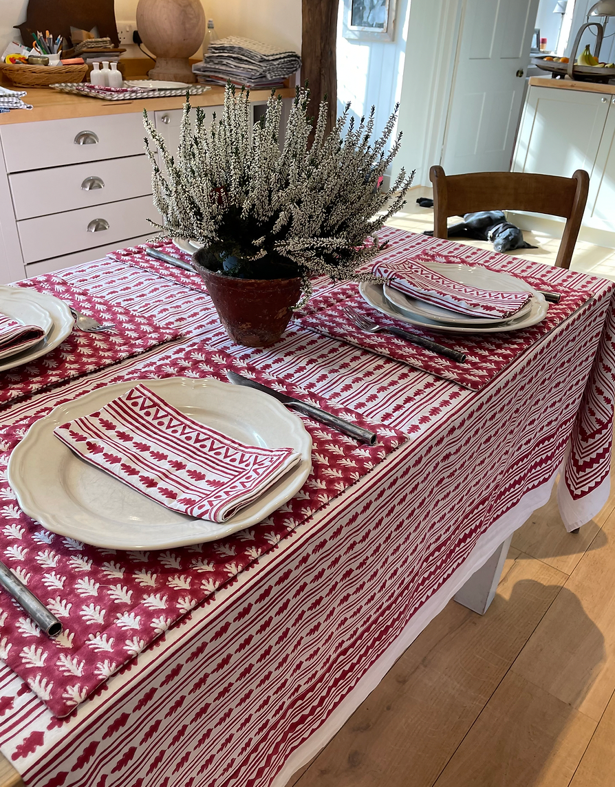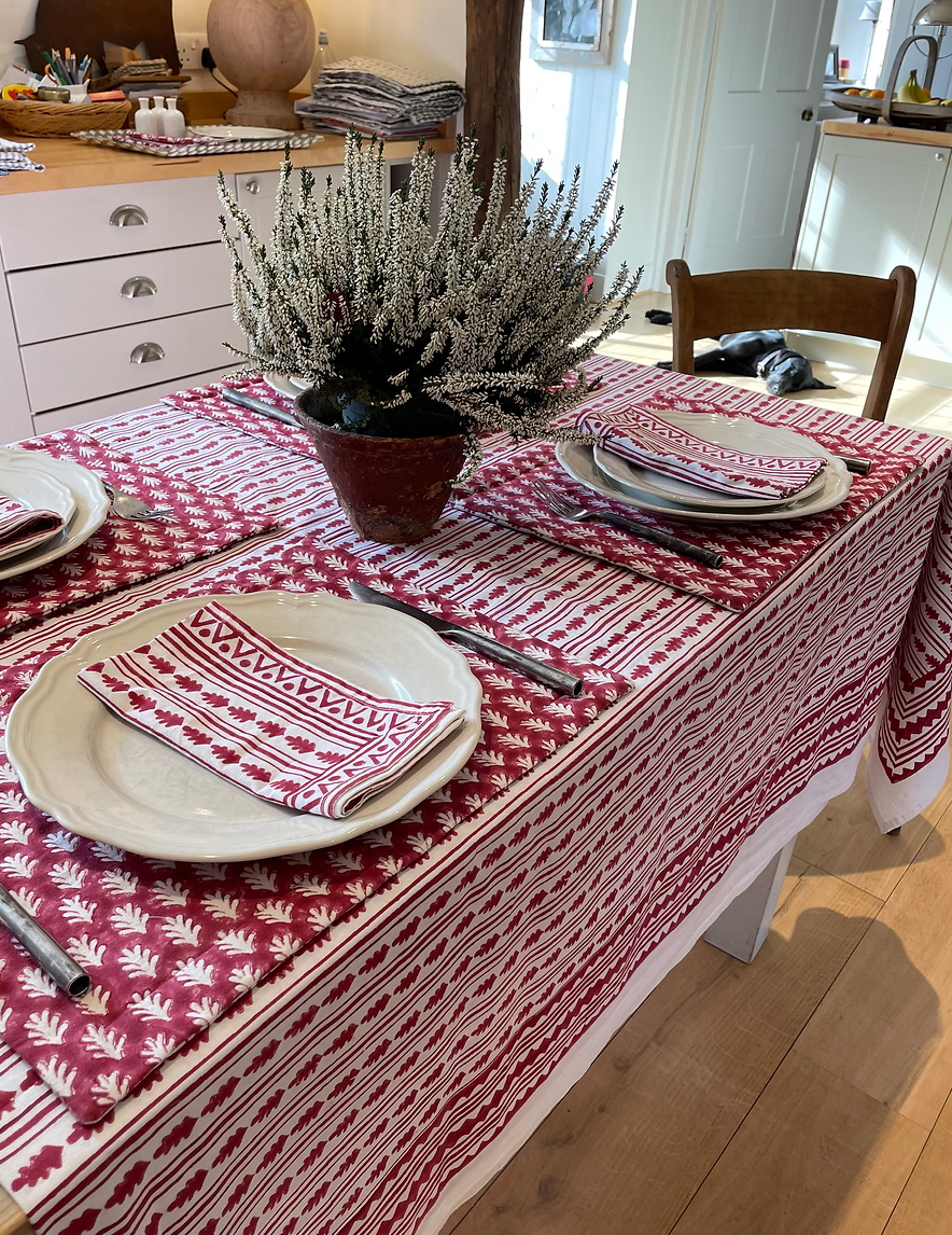 Equally gorgeous in the garden or on a kitchen or dining table! Fantastic for everyday or super-special gatherings surrounded by friends. 100% heavy organic quality cotton. Vibrant and happy colours. Each design has its own striking border. Washes beautifully. Pair with Red KaHo Stripe Napkins or Red Acorn Napkins and contrasting cushions around the table!