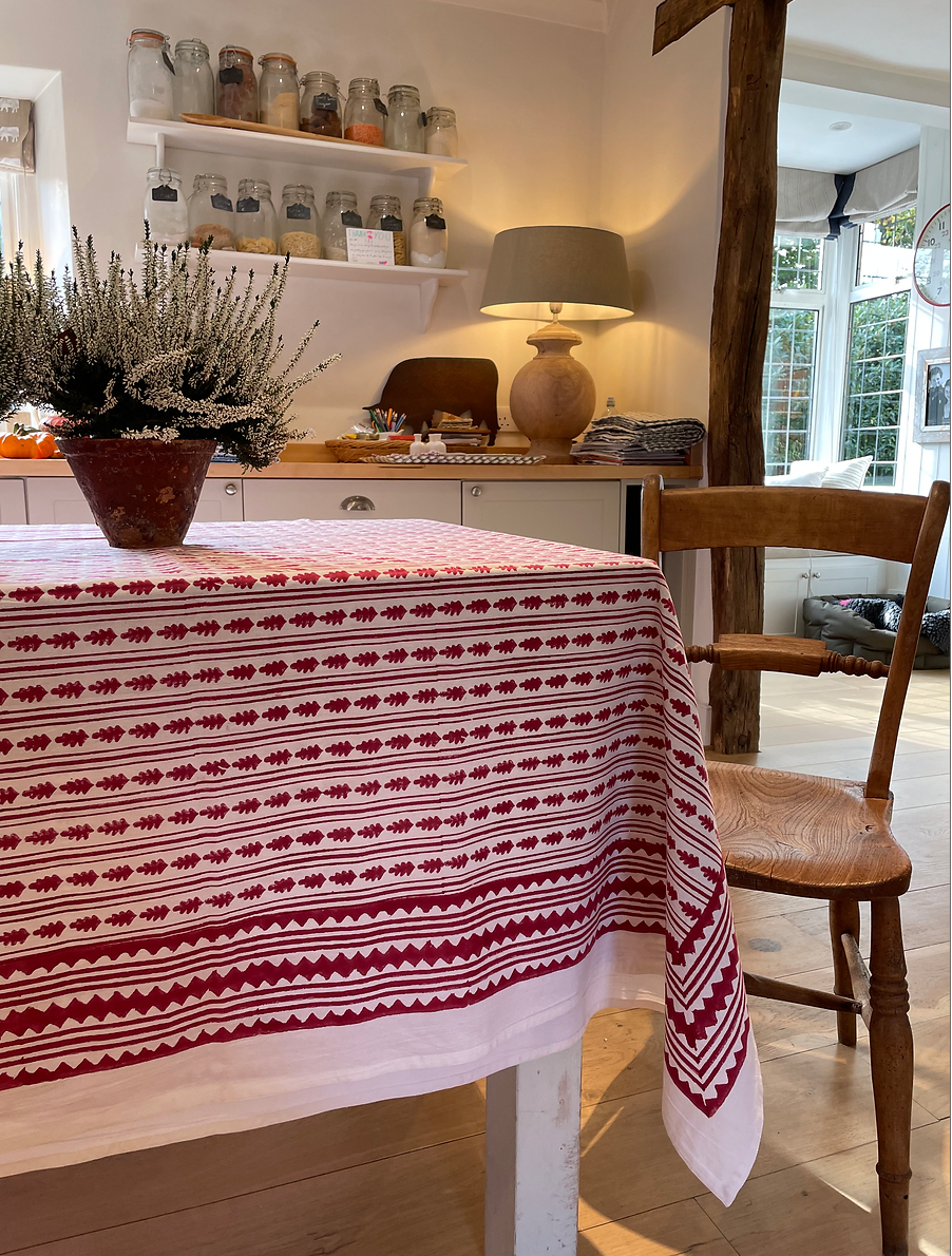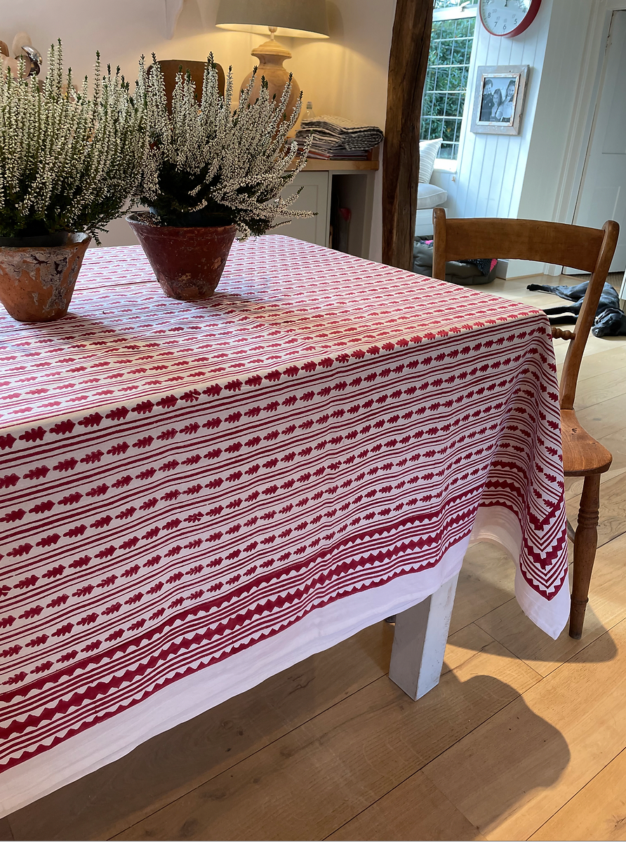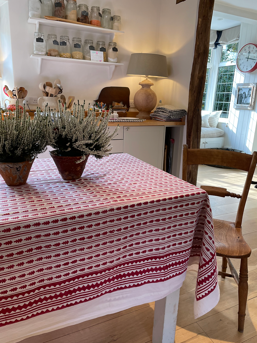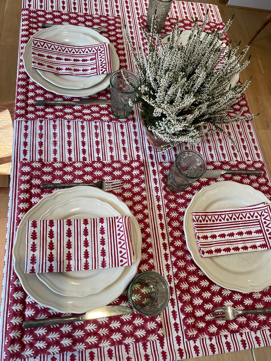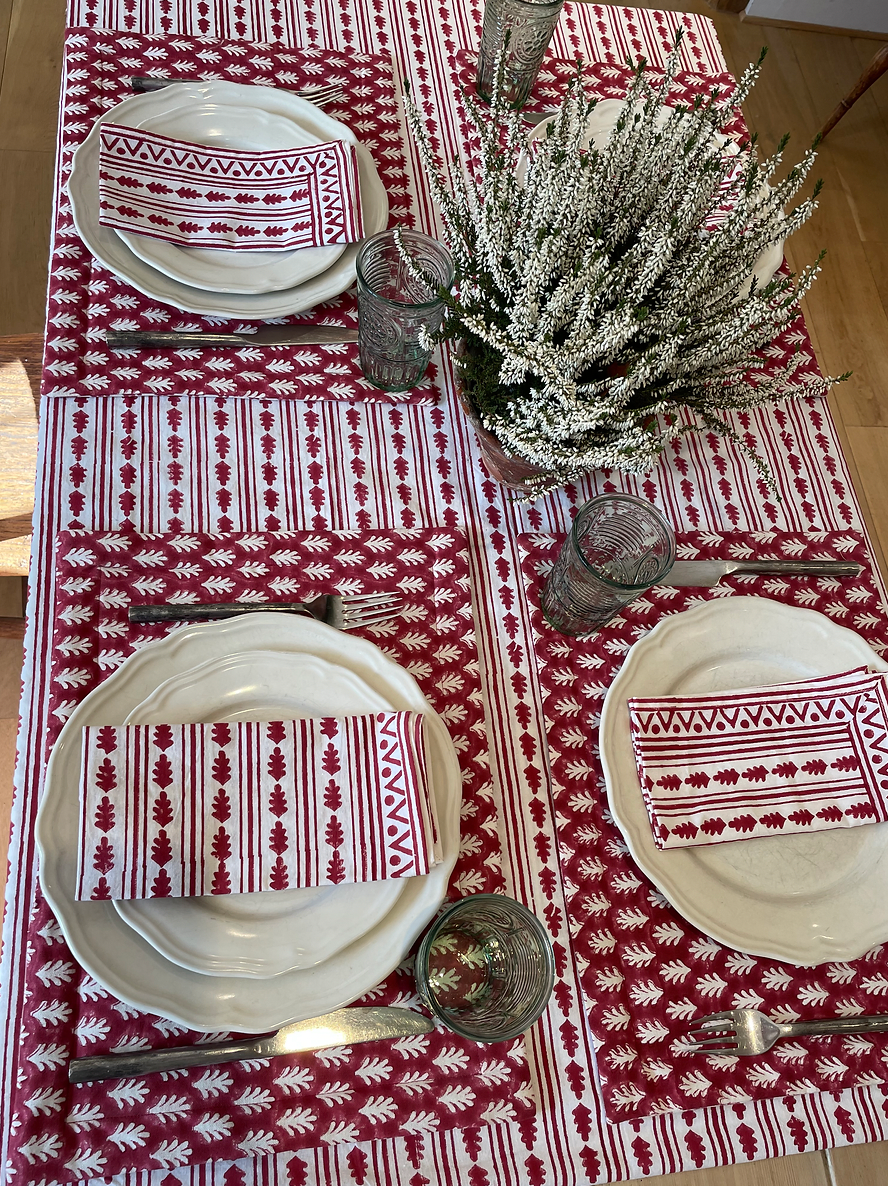 Equally gorgeous in the garden or on a kitchen or dining table! Fantastic for everyday or super-special gatherings surrounded by friends. 100% heavy organic quality cotton. Vibrant and happy colours. Each design has its own striking border. Washes beautifully. Pair with Red KaHo Stripe Napkins or Red Acorn Napkins and contrasting cushions around the table!