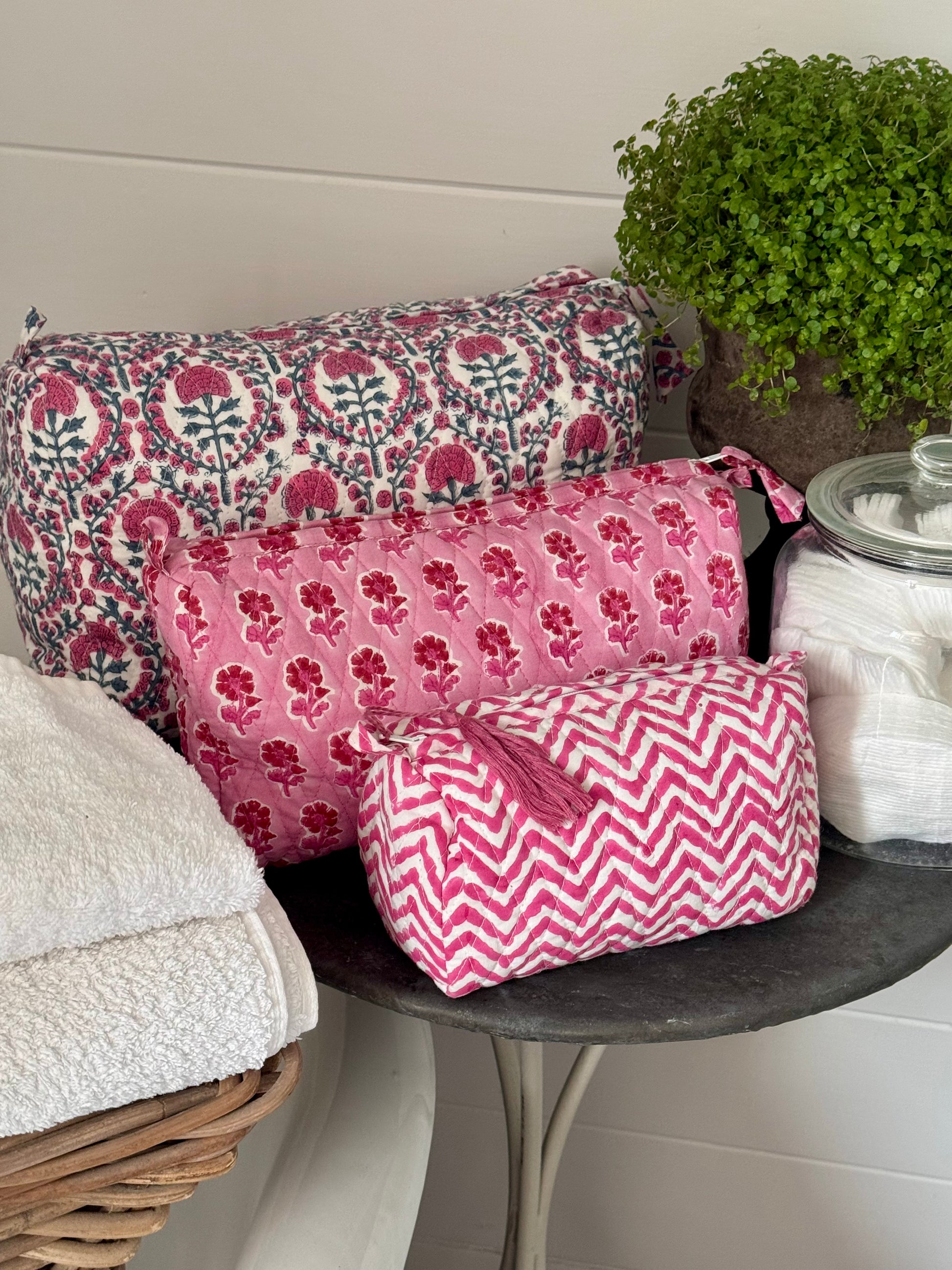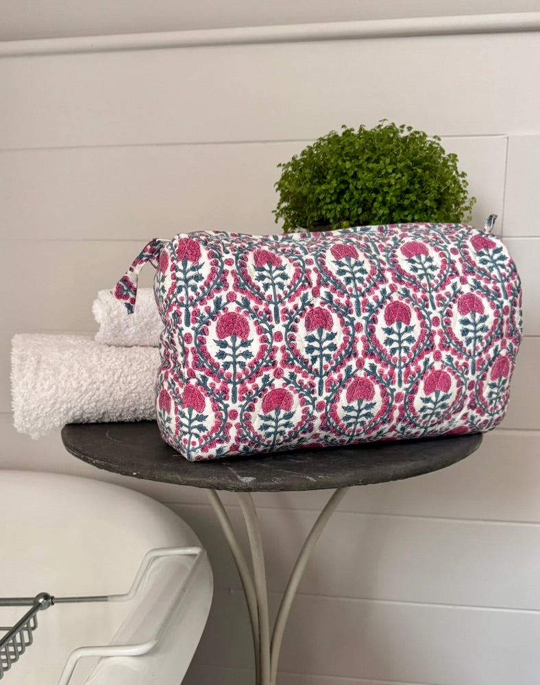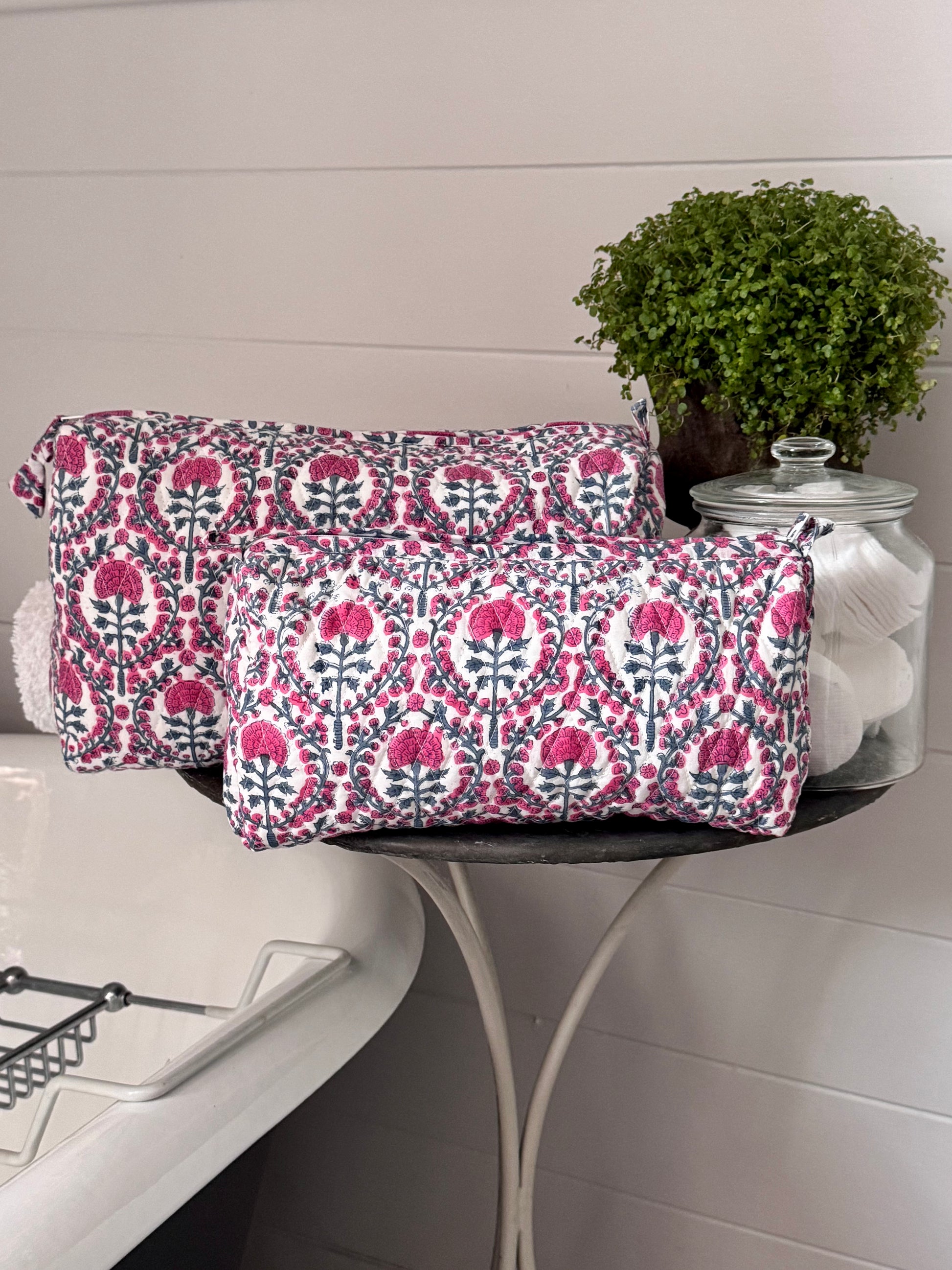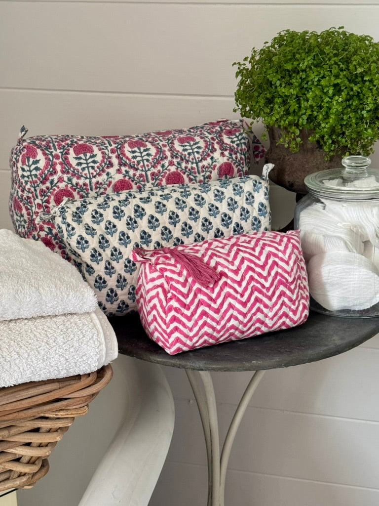 Pairs perfectly with the Pink and Blue Trellis Make Up Bag