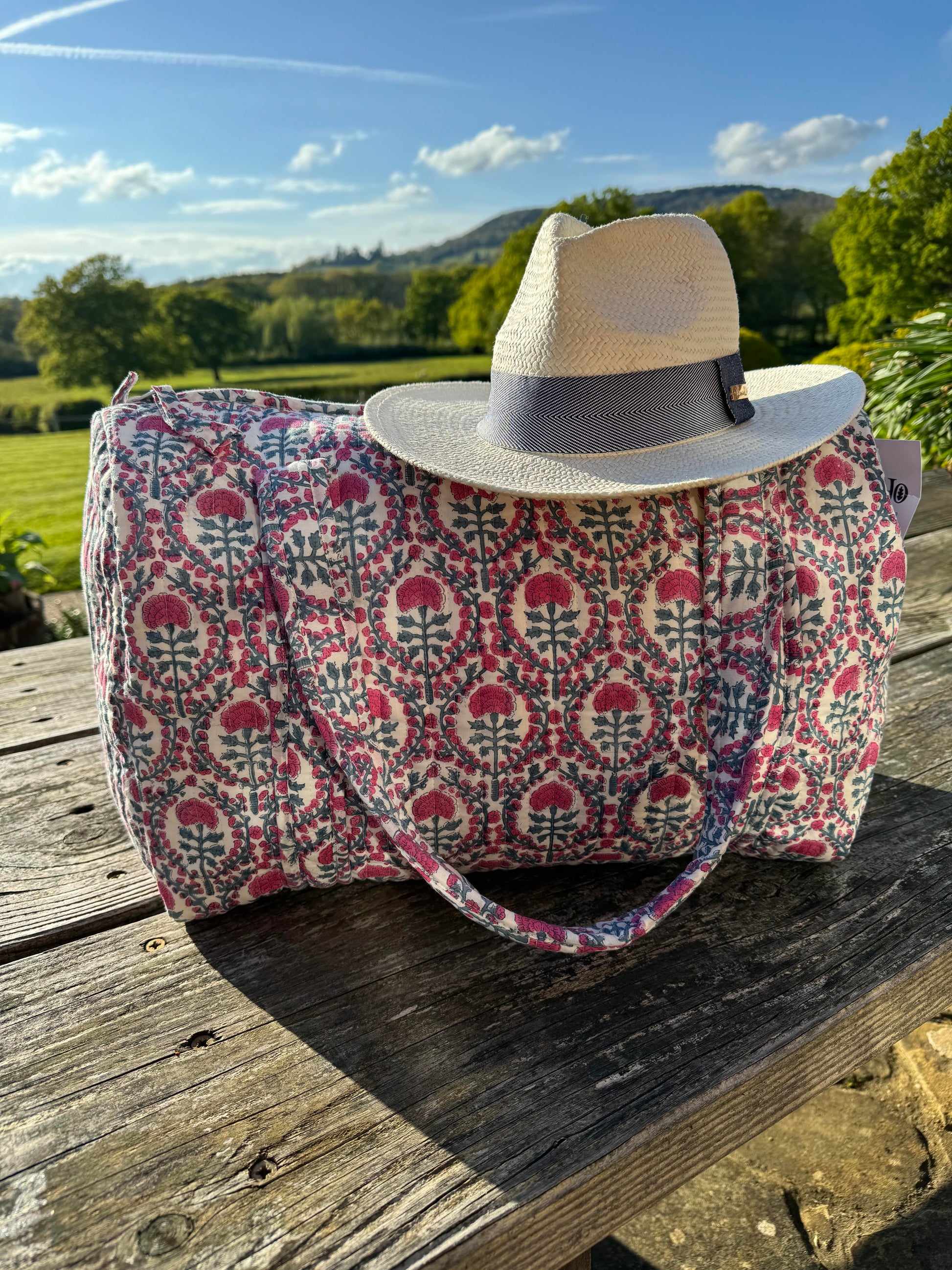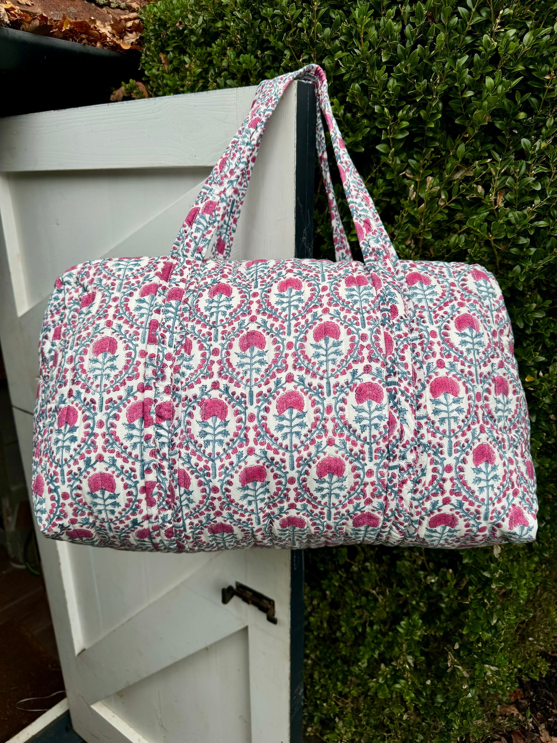 We are so excited to share these gorgeous hand block printed weekend bags with you.