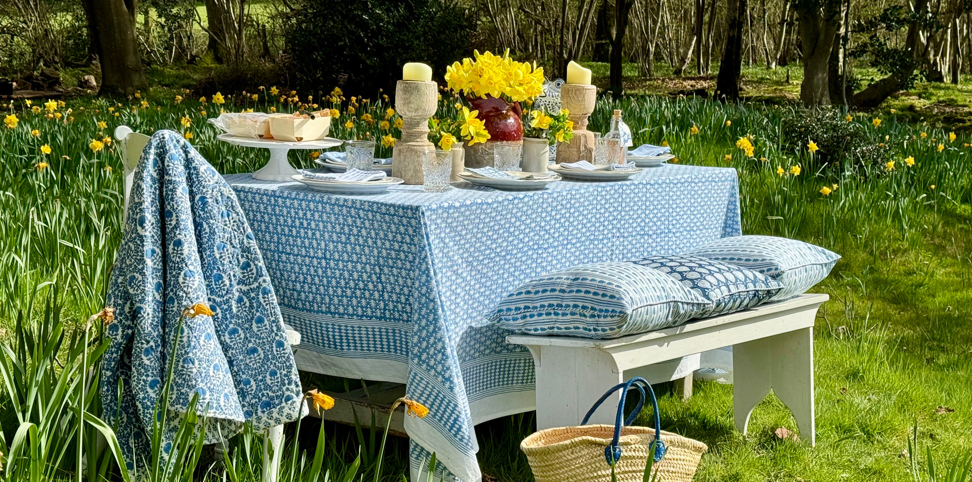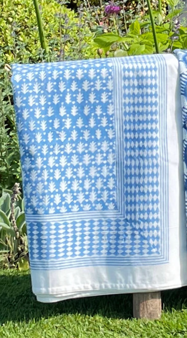 Equally gorgeous in the garden or on a kitchen or dining table! Fantastic for everyday or super-special gatherings surrounded by friends. 100% heavy organic quality cotton. Vibrant and happy colours. Each design has its own striking border. Washes beautifully. Pair with Blue Acorn Napkins and contrasting cushions around the table!
