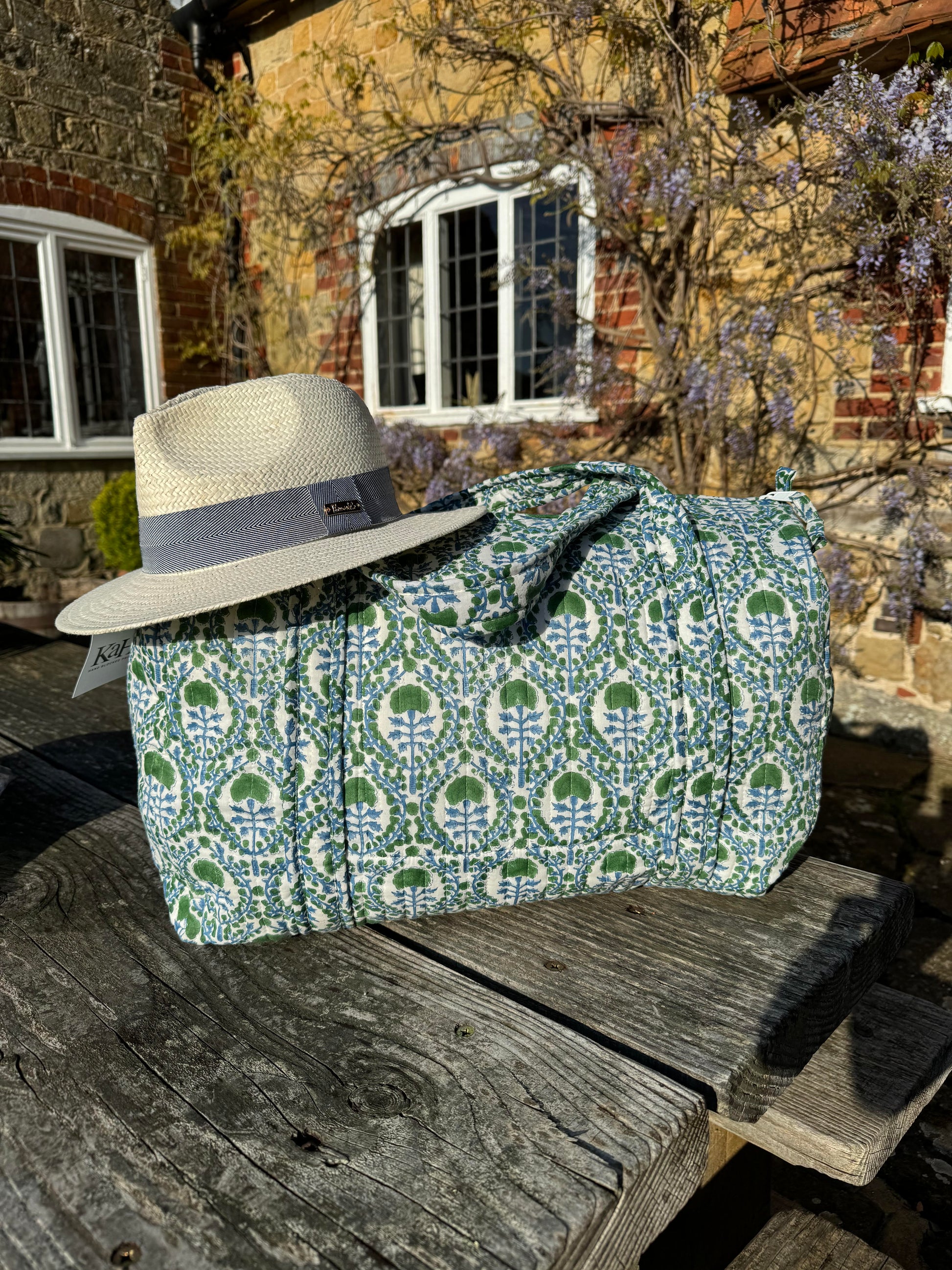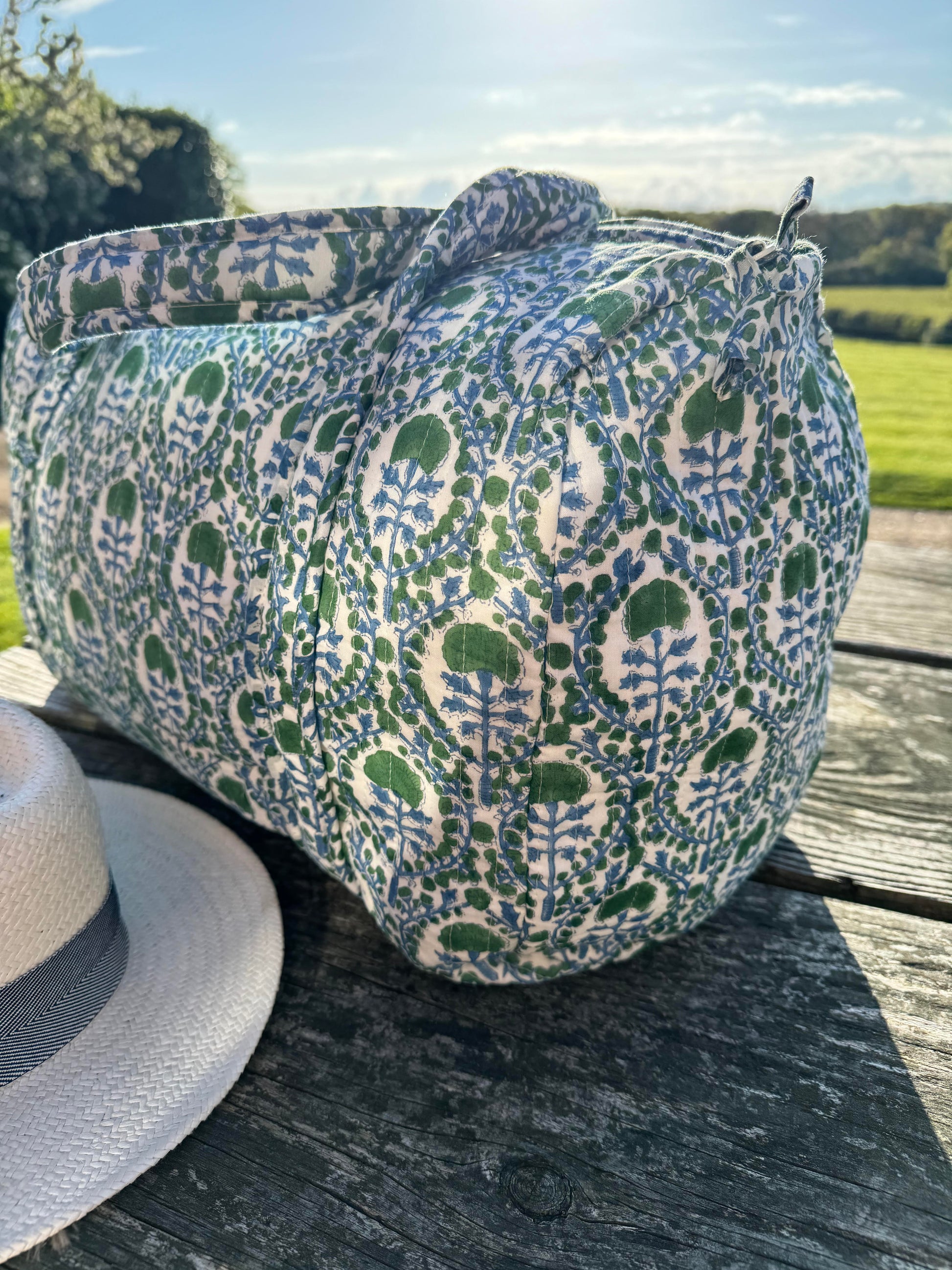 We are so excited to share these gorgeous hand block printed weekend bags with you.