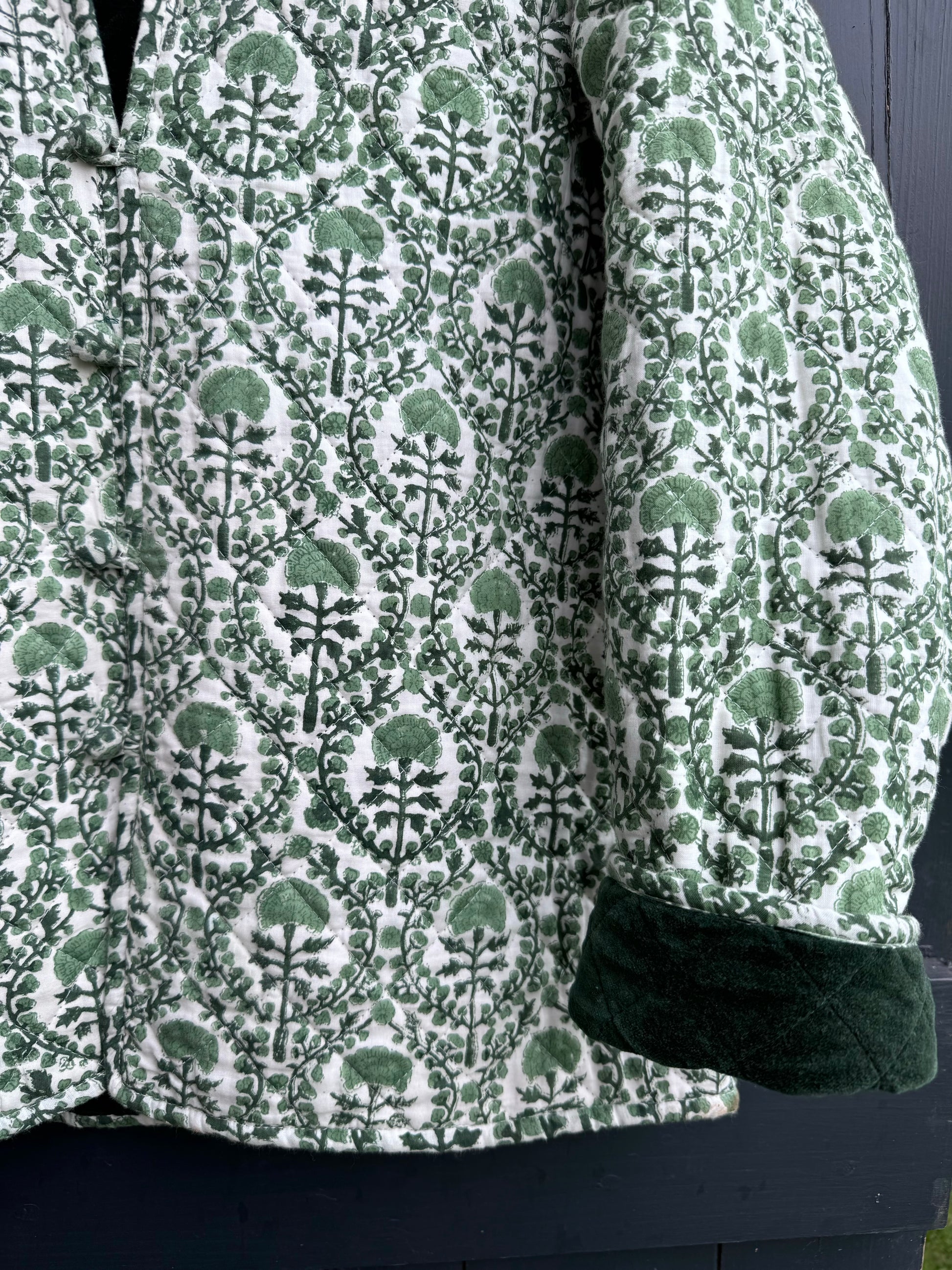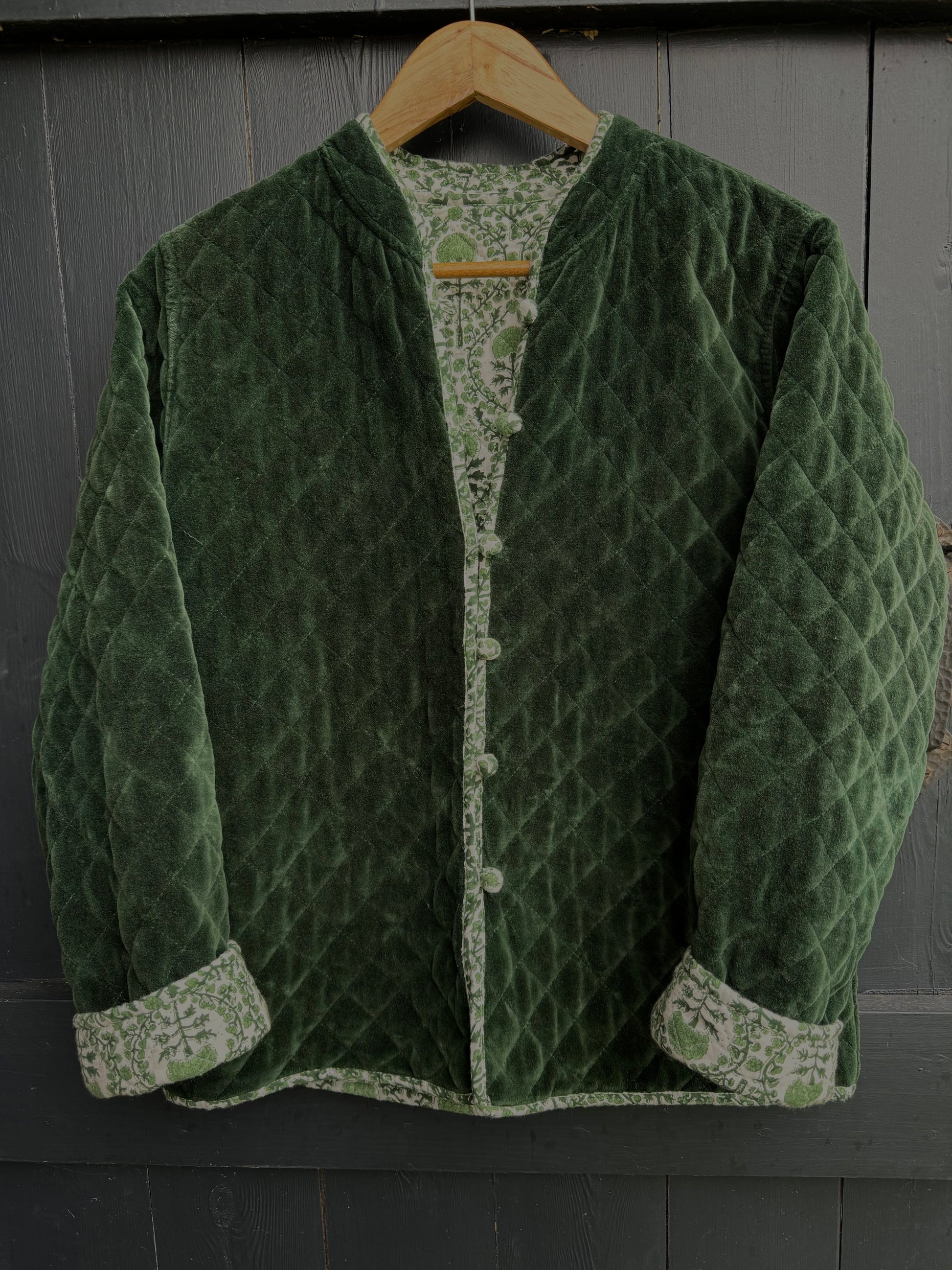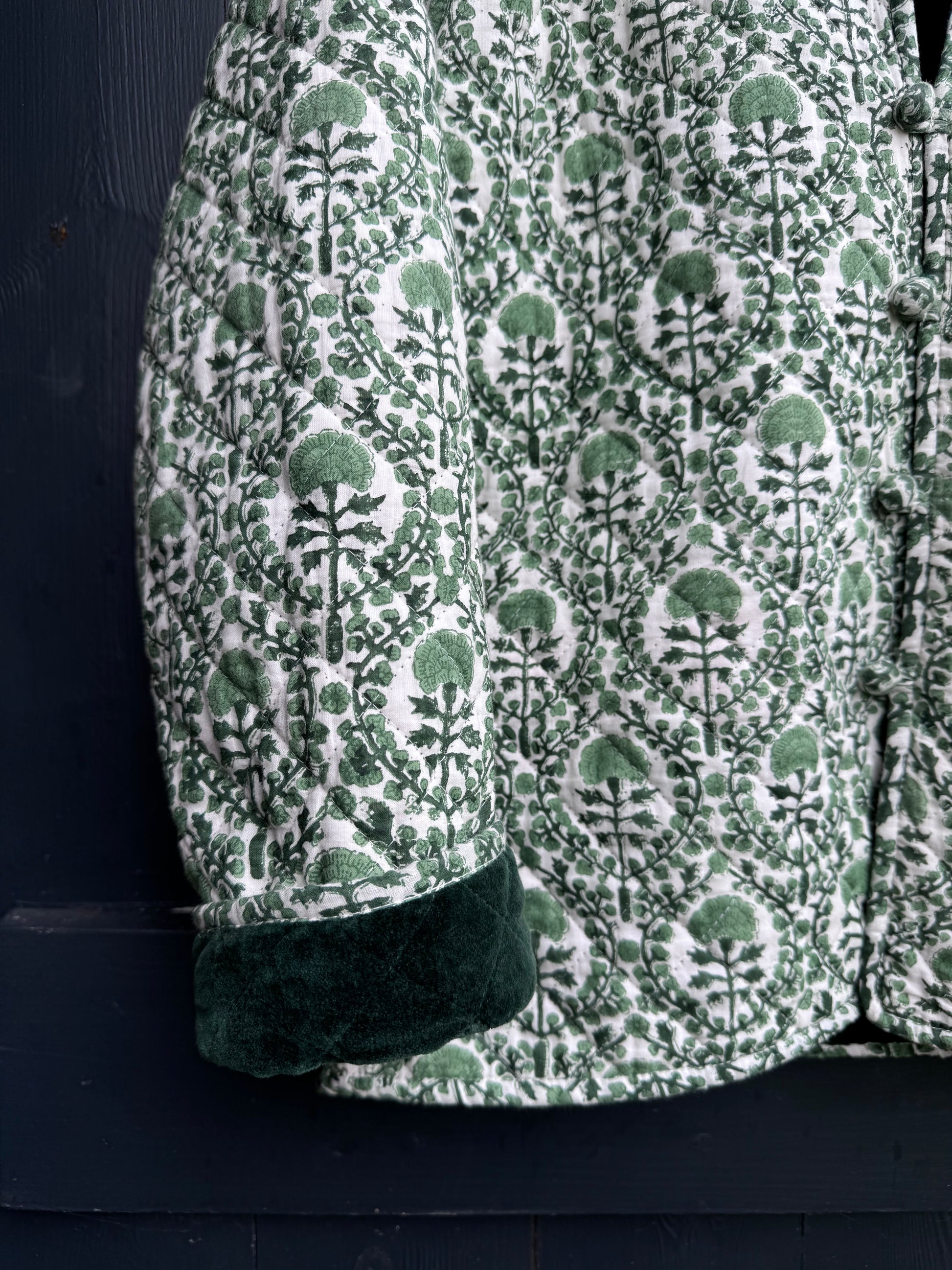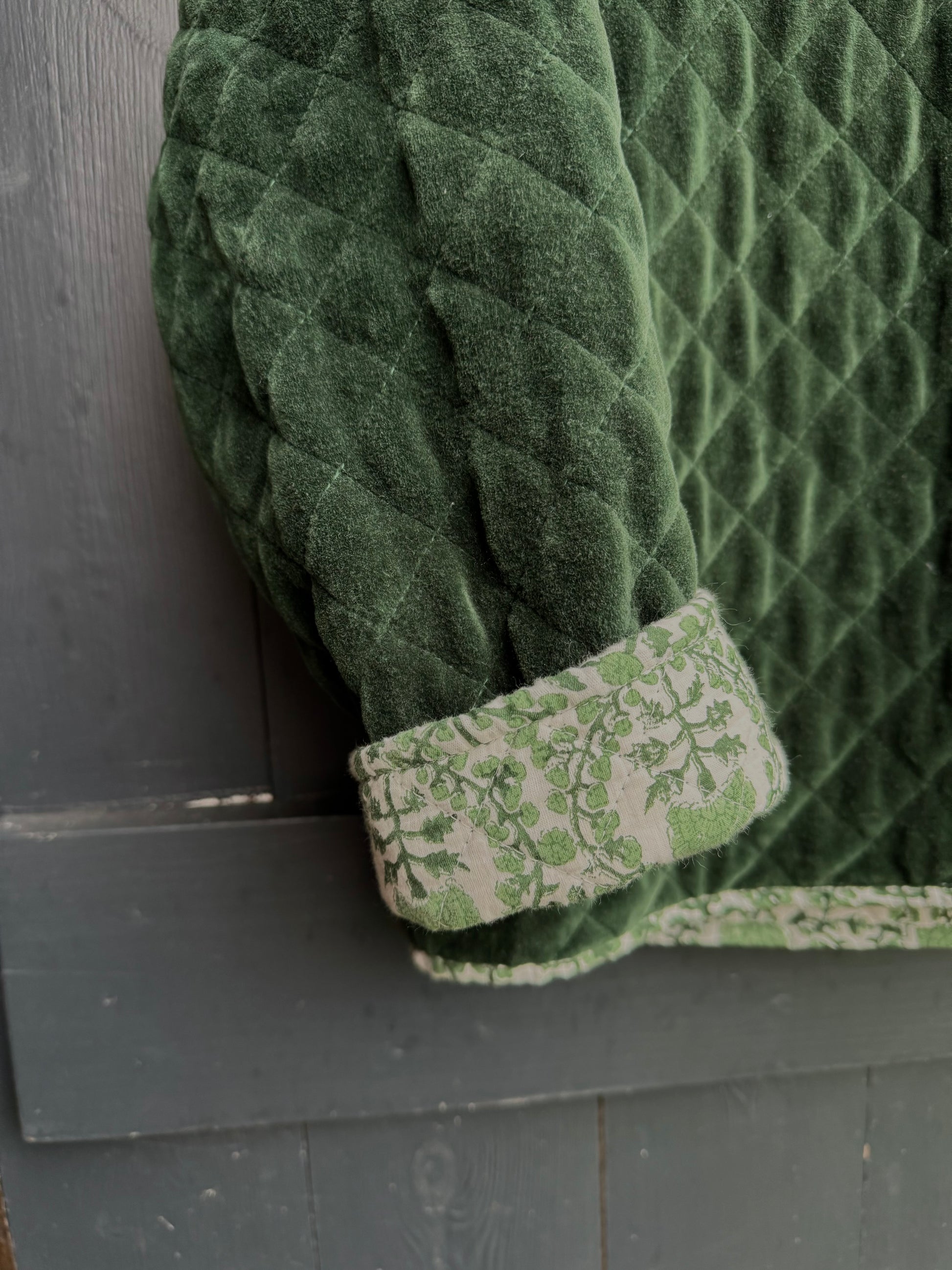 The same cut and style as our much loved cotton quilted jackets but for this season combine a classic KaHo print with a contrasting elegant and luscious velvet!